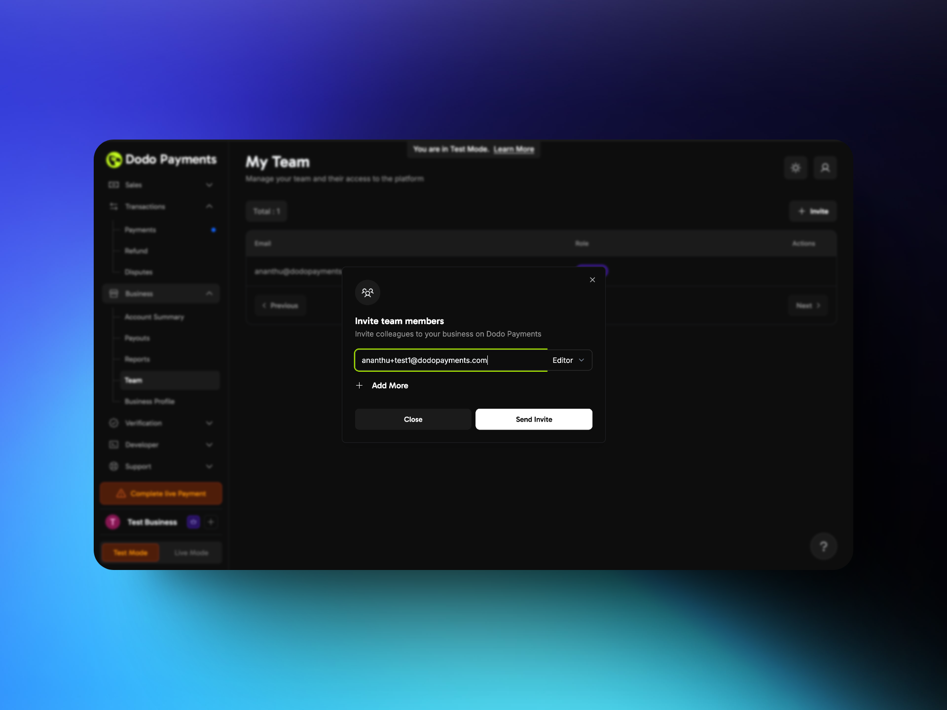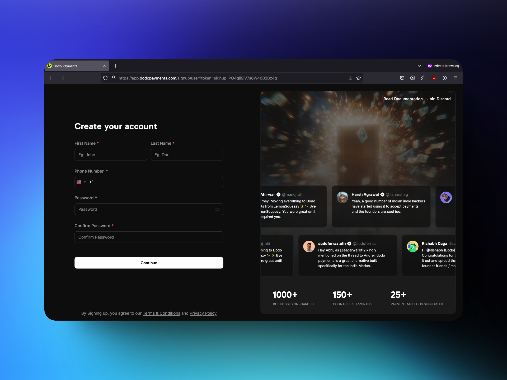 - If they do not have a Dodo Payments account, they are directed to the signup page where they need to provide the required details. If they already have a Dodo Payments account they can access the business through the business toggle on the bottom left.